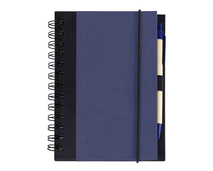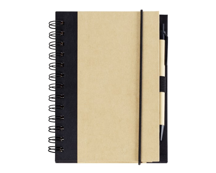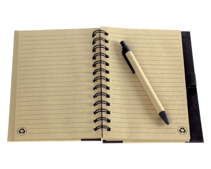 Libreta ecológica de cartón reciclado con 70 hojas rayadas (140 páginas) y espiral metálica. Incluye bolígrafo de papel.