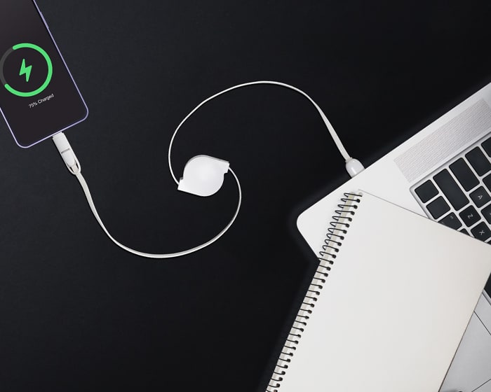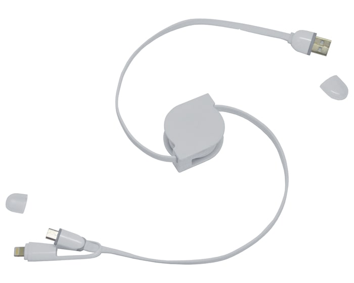 Cable retráctil para carga y transmisión de datos para dispositivos iPhone y Android. Artículo Promocional