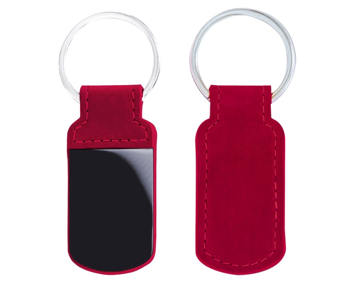 Llavero de curpiel con placa metálica para grabado láser y arillo metálico reforzado.