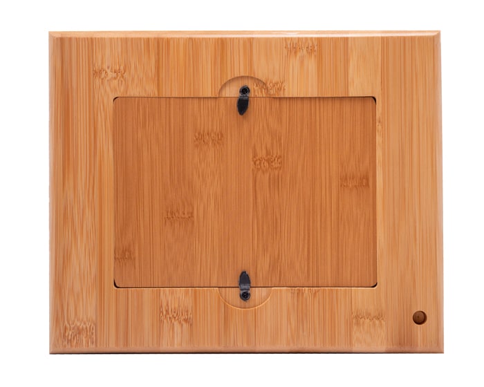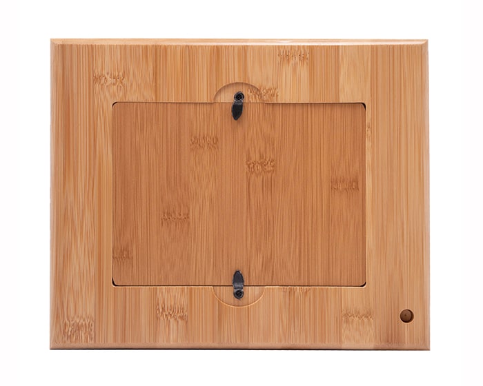 Portarretrato de bambú con ventana de vidrio. Incluye soporte para colocar el marco en posición horizontal y vertical. Presentación: caja en color café.