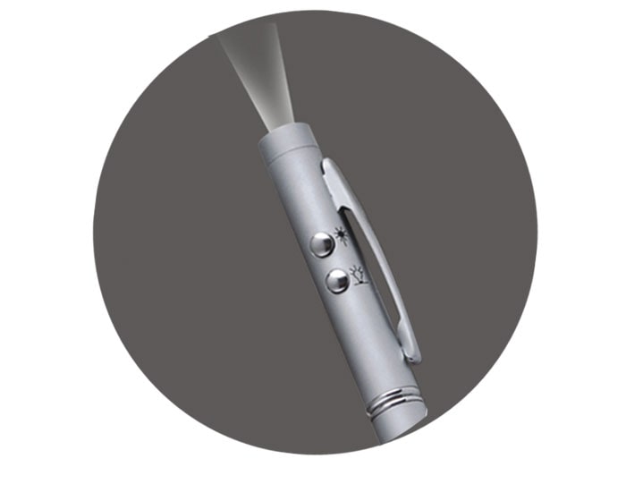 Bolígrafo metálico con luz y señalador láser, ideal para presentaciones. Presentación: estuche de aluminio en color plata. Incluye 3 pilas en uso y 3 pilas de repuesto.