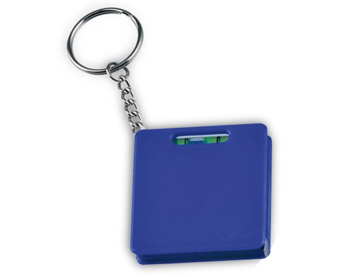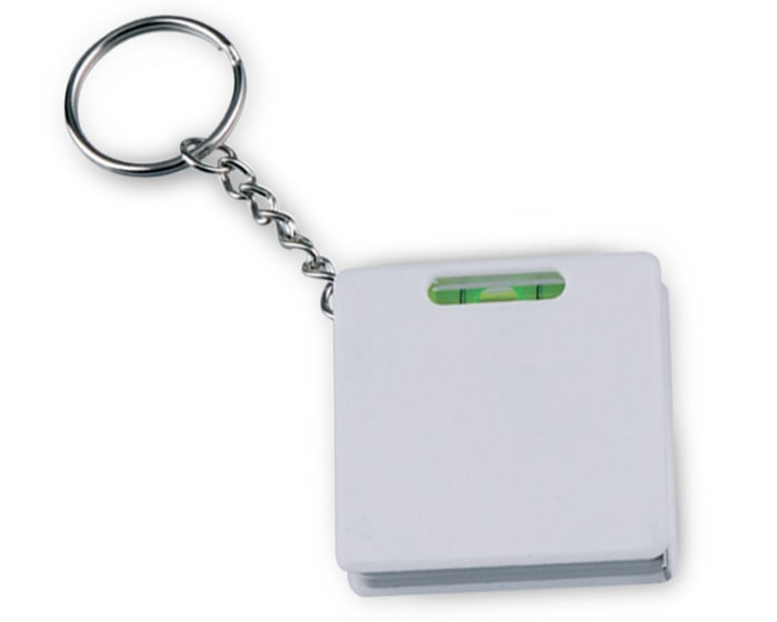 Llavero de plástico con nivelador y flexómetro de 1 m.