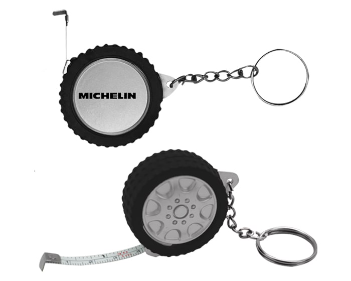 Llavero plástico en forma de llanta con flexómetro de 1 m. de largo. Artículo Promocional