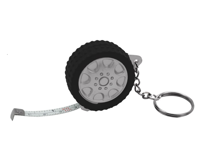 Llavero plástico en forma de llanta con flexómetro de 1 m. de largo.