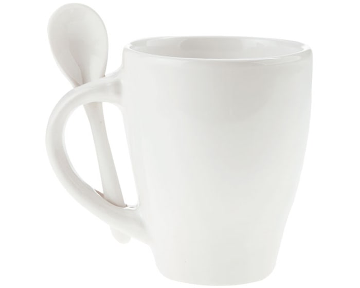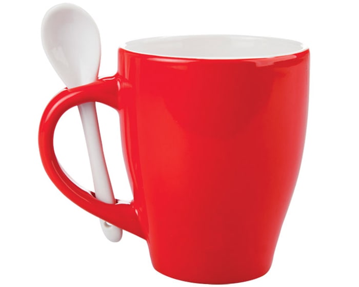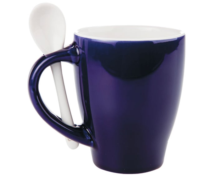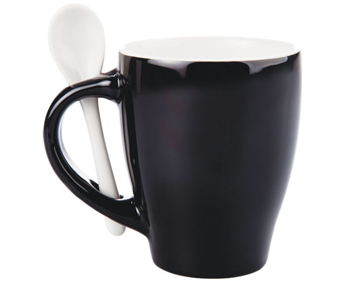 Taza bicolor con cuchara. CAP. 12 OZ. Presentación: caja individual.