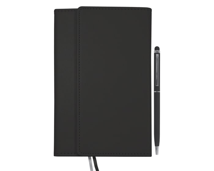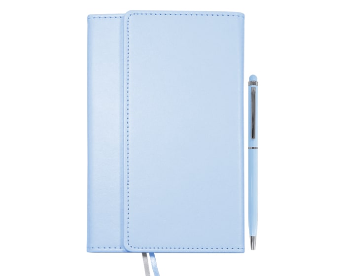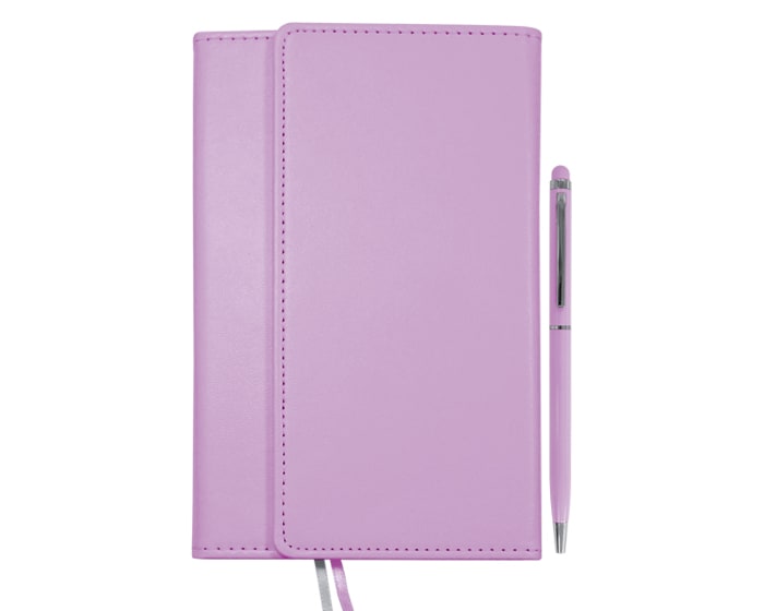 Libreta personal tipo agendario estilo cartera, de 99 hojas (198 páginas). Su cubierta cuenta con 4 compartimentos para credenciales, uno con ventana plástica; separador de doble de listón y bolígrafo metálico con punta touch, el cual es de mecanismo retráctil, del color de la libreta. Contiene: hoja de datos personales, hojas rayadas con área para fecha, hojas punteadas para gráficos o dibujos y sección de directorio de contactos. Presentación: caja en color blanco con cubierta transparente.