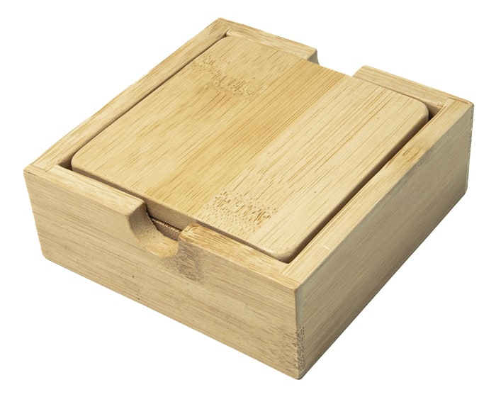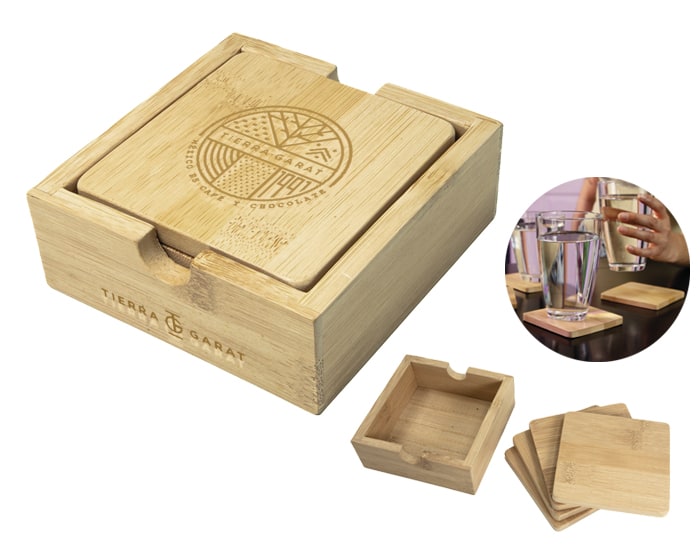 Juego de portavasos de bambú que incluye: 4 portavasos y una base para guardar. Presentación: caja en color blanco. Artículo Promocional