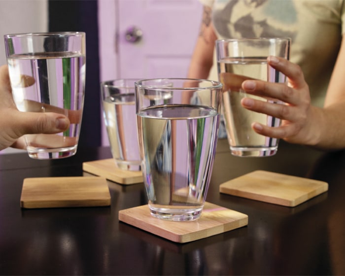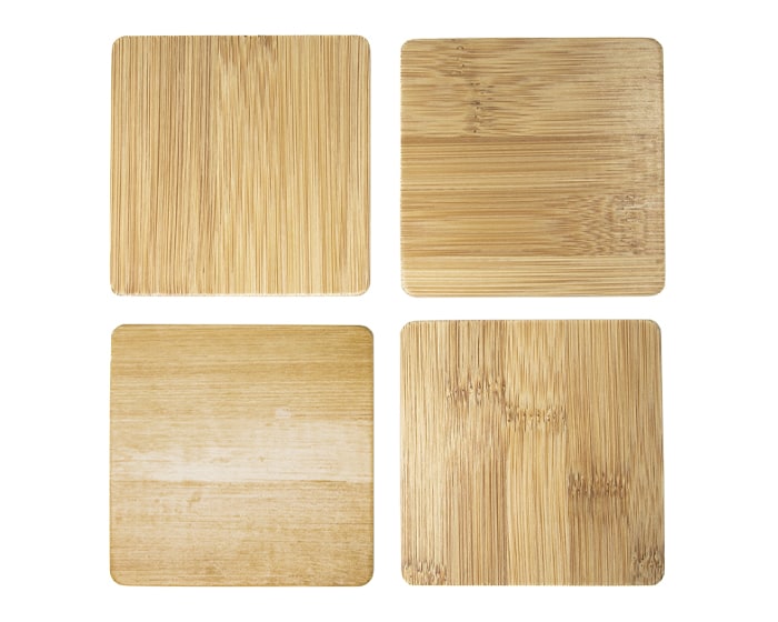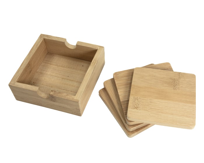 Juego de portavasos de bambú que incluye: 4 portavasos y una base para guardar. Presentación: caja en color blanco.