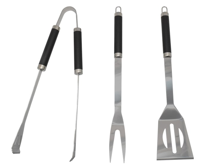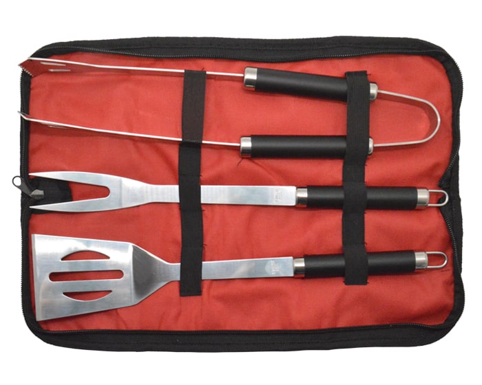 Estuche portátil con utensilios para BBQ. Incluye: pinzas para carne, tenedor y volteador.