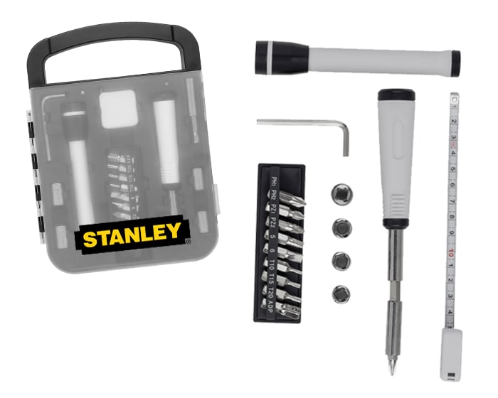 Kit de herramientas de 19 piezas ideal para uso doméstico. Incluye: desarmador, extensión, 10 puntas de desarmador; 4 dados, desarmador hexagonal, mini flexómetro de 1 m. y linterna que utiliza baterías, (2 pilas AAA) no incluidas. Presentación: caja en color blanco.