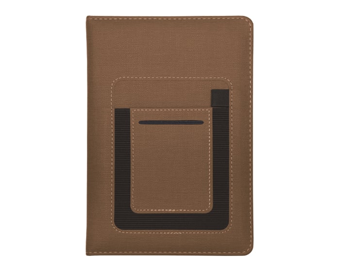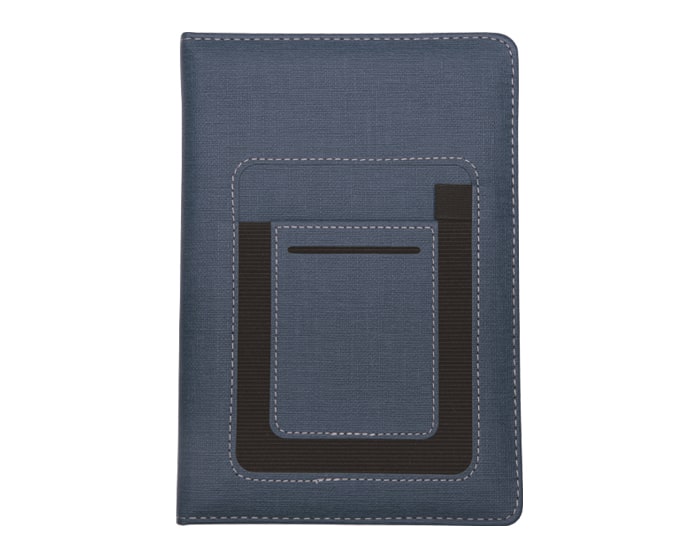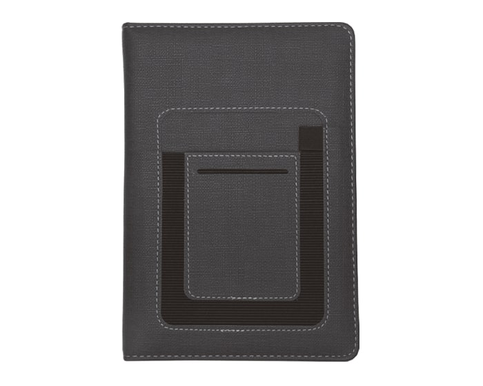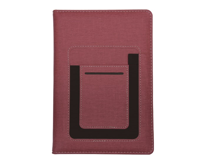 Libreta personal de 80 hojas (160 páginas) con cubierta de curpiel texturizada. Contiene 2 compartimentos uno para tarjetas y otro para celular o notas y banda elástica para bolígrafo.