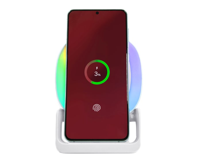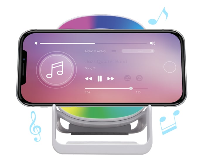 Bocina Bluetooth portátil de carga rápida Qi (15W), cuenta botón touch para encender/apagar y cambiar la modalidad de la luz, luz LED multicolor, al grabar en láser en el centro de la bocina, destapa con luz LED. Cuenta con 2 bases como soporte para colocar el dispositivo móvil de manera vertical y horizontal, puerto de carga entrada tipo C. Incluye cable de carga. Compatible con dispositivos Android e iOS. Presentación: caja de regalo a color.