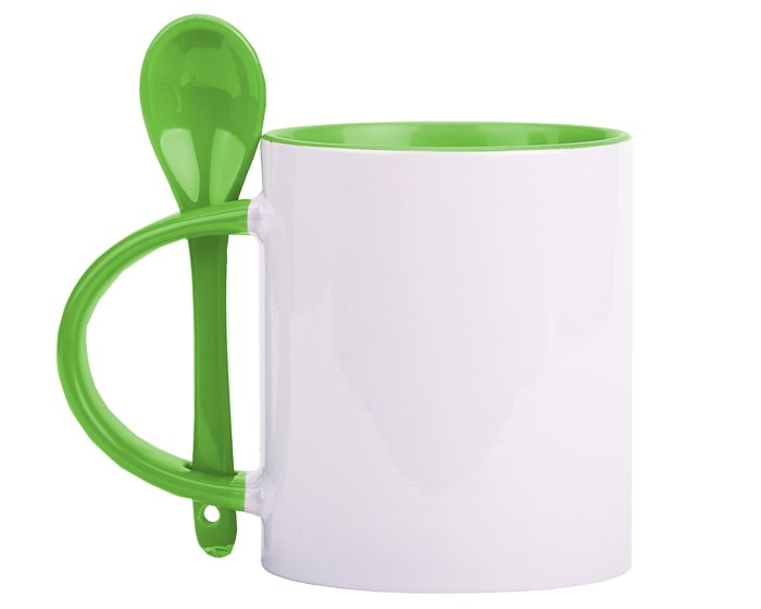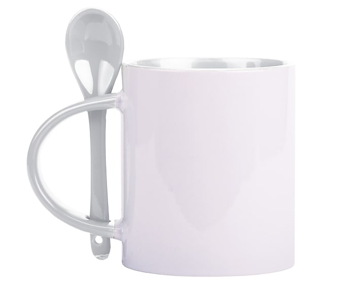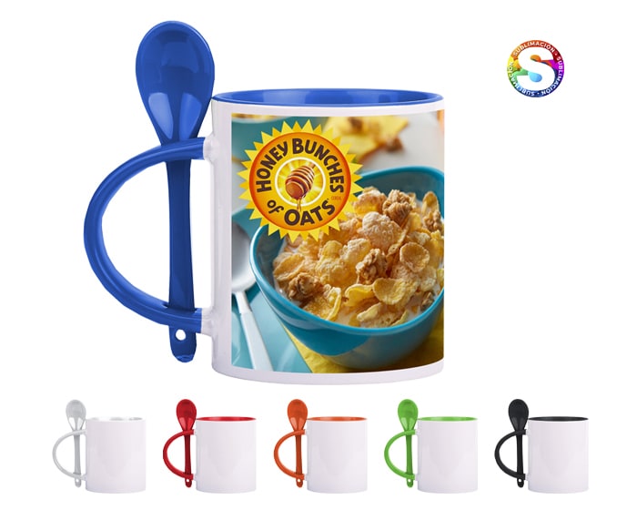 Tarro de cerámica con cuchara para sublimación. El asa, cuchara e interior de la taza son de color diferente. CAP. 325 ml. (11 OZ). Presentación: caja en color blanco.