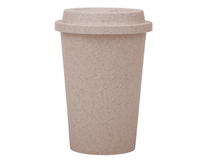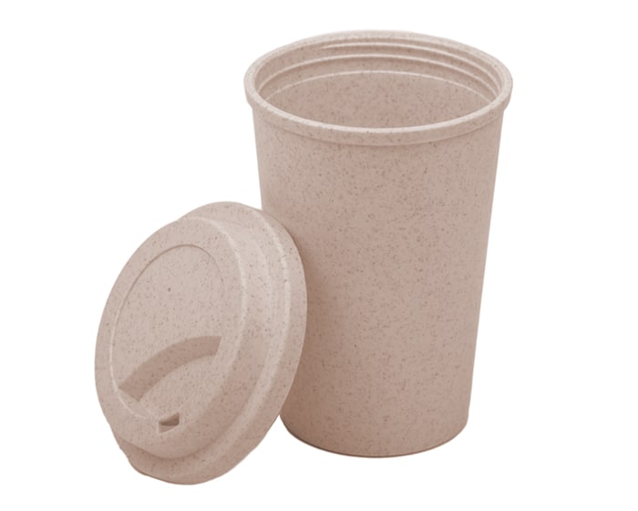 Vaso ecológico a base de fibra de trigo para bebidas calientes. Con tapa de rosca anti derrames. CAP. 325 ml.