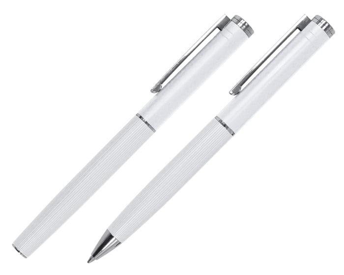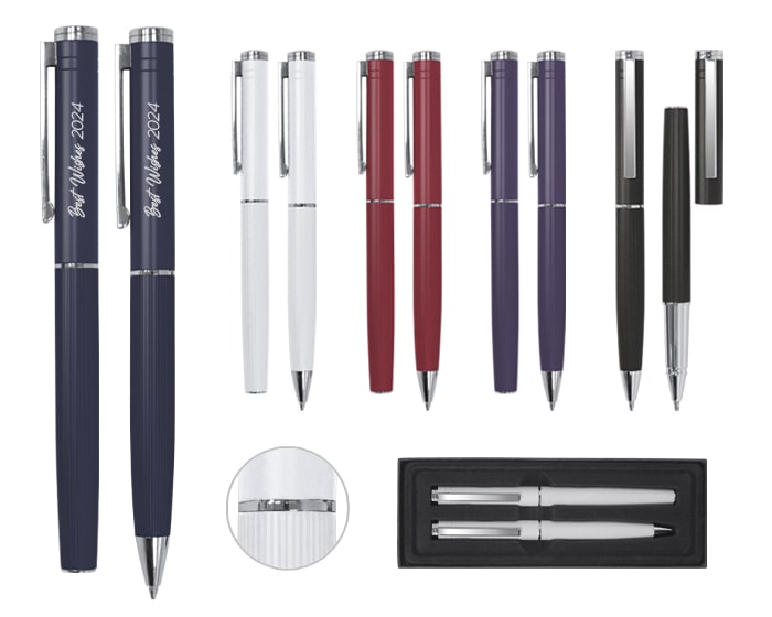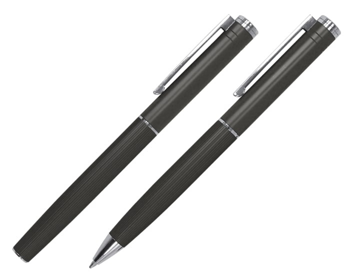 Set de bolígrafos metálicos, lisos en su parte superior y con una sutil textura de líneas verticales en su parte inferior; esmaltado mate con detalles en color plata en el centro, extremos y clip. Un bolígrafo es tipo roller y el otro es con sistema retráctil. Cuenta con repuesto metálico. Presentación: caja de regalo color negro.