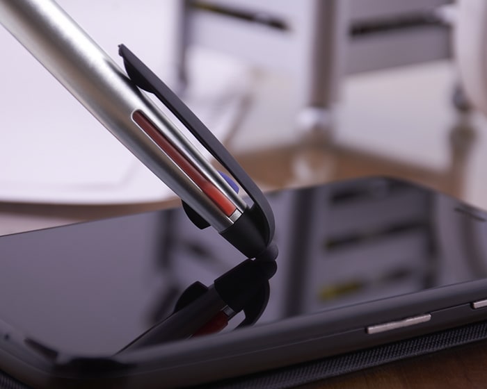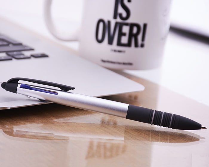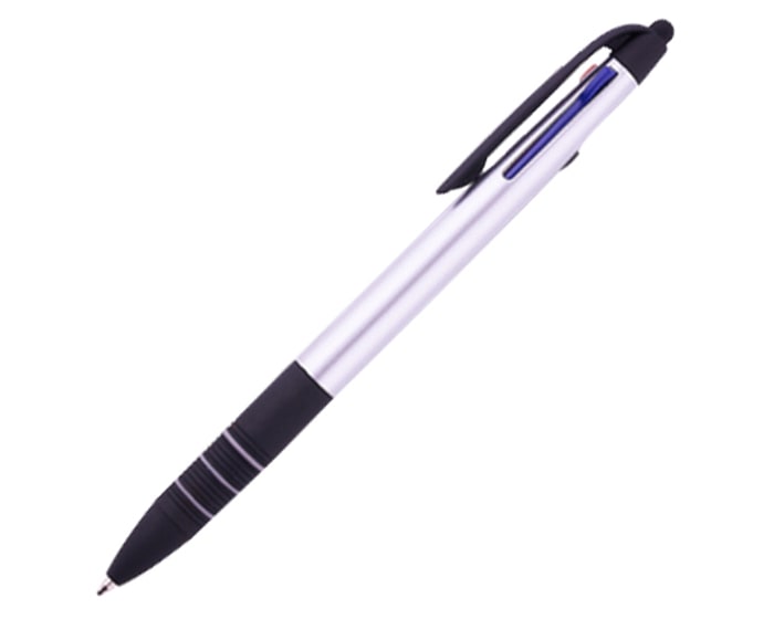 Bolígrafo plástico con terminado metalizado. Tiene integradas 3 tintas: negra, roja y azul. Parte inferior con goma antideslizante en negro con detalles de arillos en gris. Cuenta con touch para dispositivos táctiles. Mecanismo deslizante para cambio de tinta.