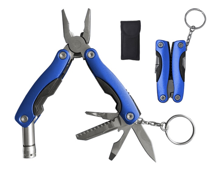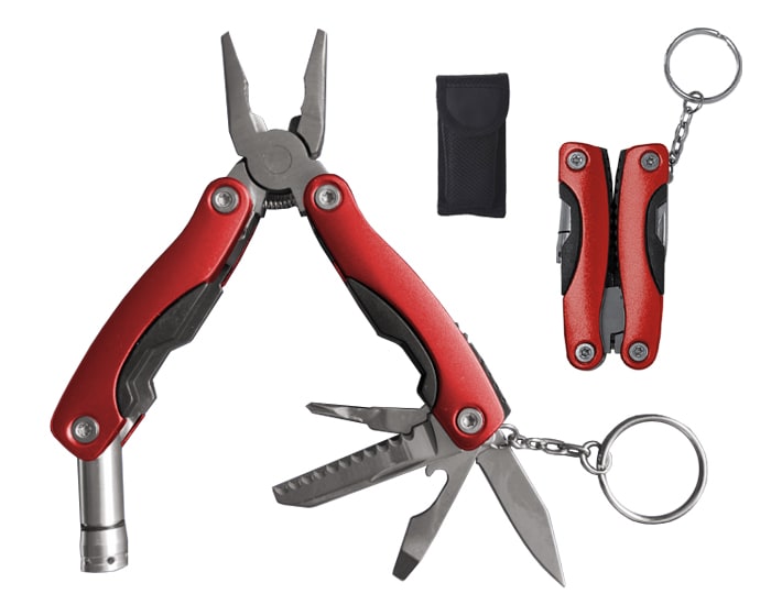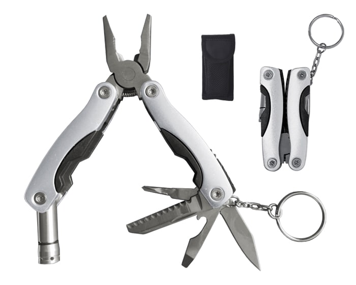 Llavero herramienta multiusos. Con pinzas, navaja, lámpara LED de luz blanca, sierra, desarmador y destapador. Incluye funda. Presentación: caja individual. Artículo Promocional