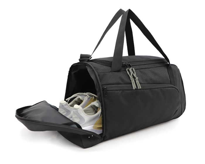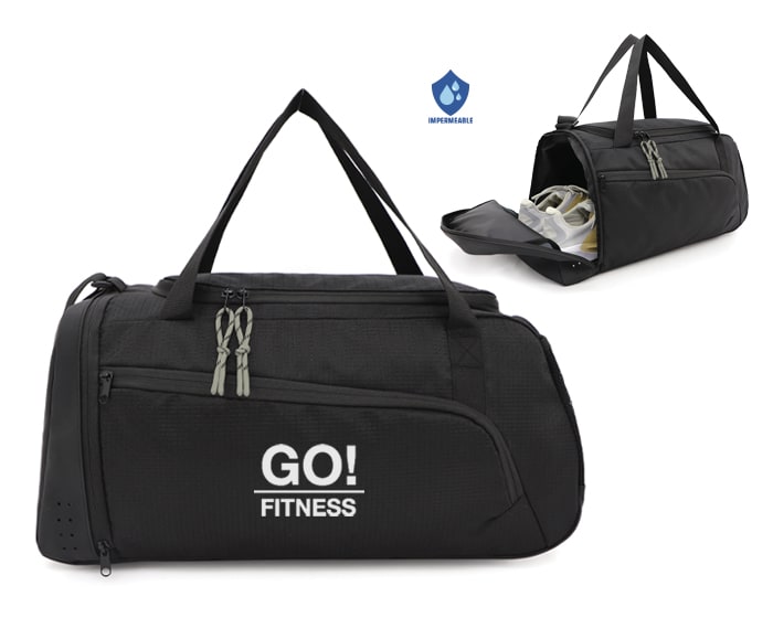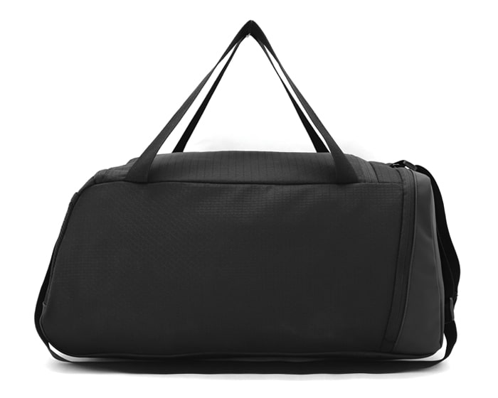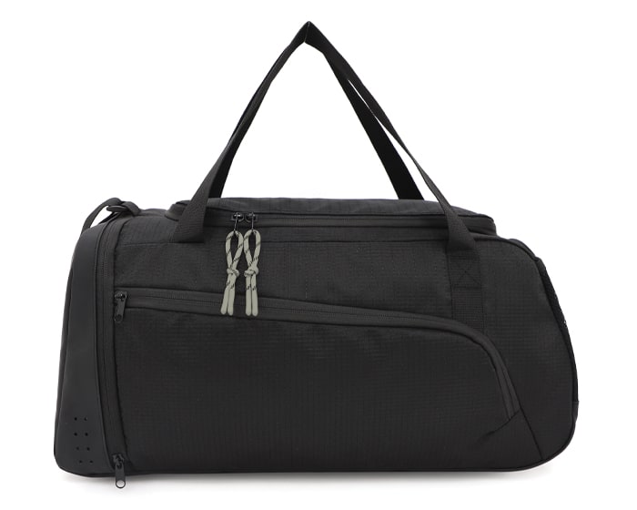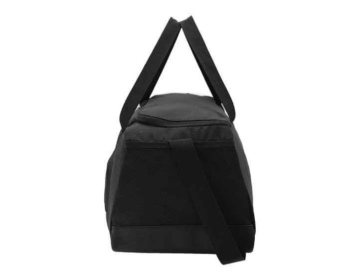 Maleta estilo deportivo de poliéster texturizado, el compartimento principal abre en forma de tapa lateral con 2 tiradores de cierre, para darle mayor amplitud al momento de su uso, cuenta con una pequeña bolsa interna con cierre, para accesorios pequeños. La parte exterior trae un amplio bolsillo frontal con cierre, un compartimento lateral de curpiel para zapatos y del lado opuesto, una bolsa lateral de malla. La parte de curpiel se extiende en toda la base de la maleta para mayor protección en zonas húmedas. Tiene correa larga ajustable al hombro y 2 asas cortas para su fácil manejo.