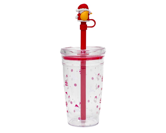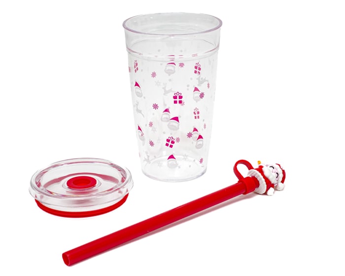 Vaso coleccionable de plástico transparente con motivos de Navidad, cuenta con tapa a presión anti derrames, sellos de silicón y popote rojo con protector de popote en forma de Santa Claus. Es ideal para bebidas frías. CAP. 450ml. Presentación: Caja kraft.