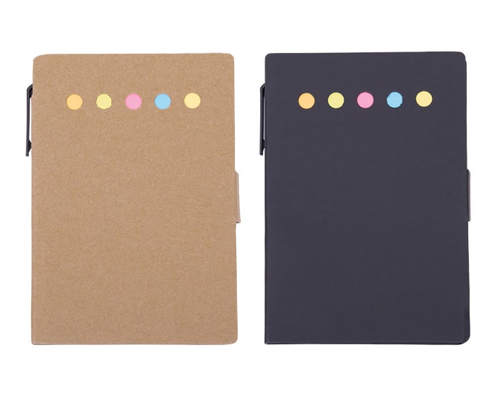 Estuche de papel reciclado con block de 60 hojas blancas y banderas adhesivas, incluye bolígrafo de papel reciclado. Artículo Promocional