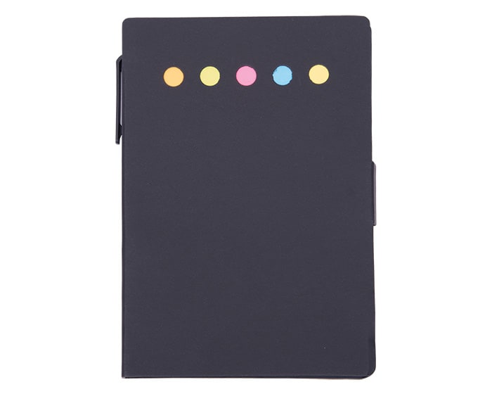Estuche de papel reciclado con block de 60 hojas blancas y banderas adhesivas, incluye bolígrafo de papel reciclado.