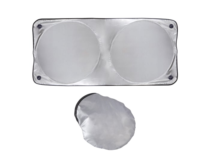 Parasol de auto plegable, evita que el interior se caliente por exposición del sol. Incluye funda para guardar.