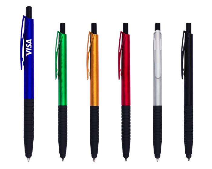 Bolígrafo de plástico en colores metálicos, punta touch y goma antideslizante. Mecanismo de click.