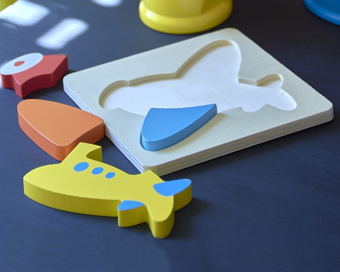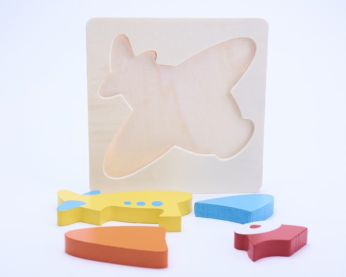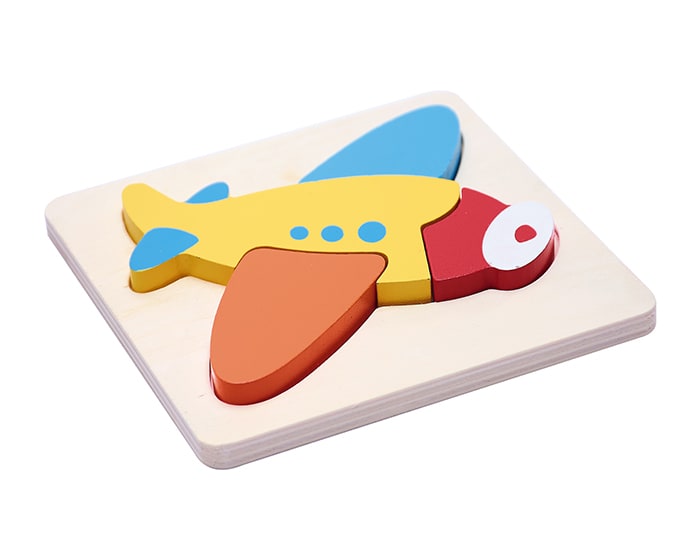 Rompecabezas de 5 piezas para armar en vivos colores, elaborado en madera con forma de avión. Entretenido, divertido y didáctico. No tóxico. Presentación: caja en color blanco.