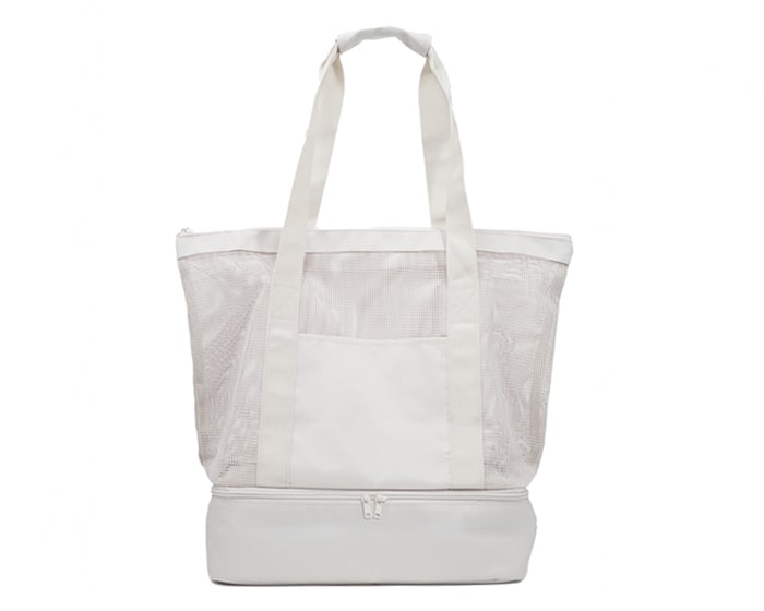 Espaciosa bolsa de malla con cierre en la parte superior y bolsillo frontal para accesorios pequeños. Cuenta con lonchera de PEVA en su base con cierre doble, para mantener alimentos y bebidas fríos por más tiempo. Tiene 2 asas del color de la bolsa. Es ideal para playa y/o lugares húmedos.