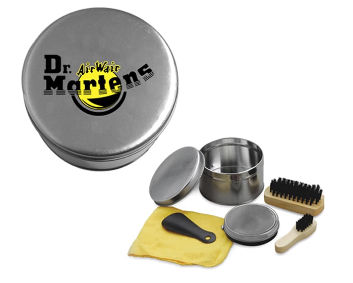 Juego de limpieza para calzado. Contenido: estuche metálico, 2 cepillos, calzador, paño y brillo para zapatos. Presentación: En caja. Artículo Promocional