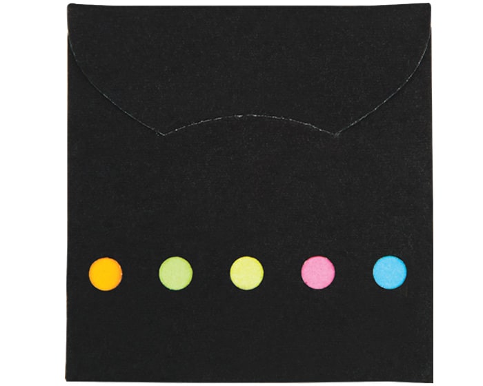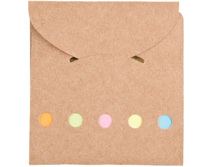 Sobre cuadrado de papel reciclado con notas y banderas adhesivas. Artículo Promocional