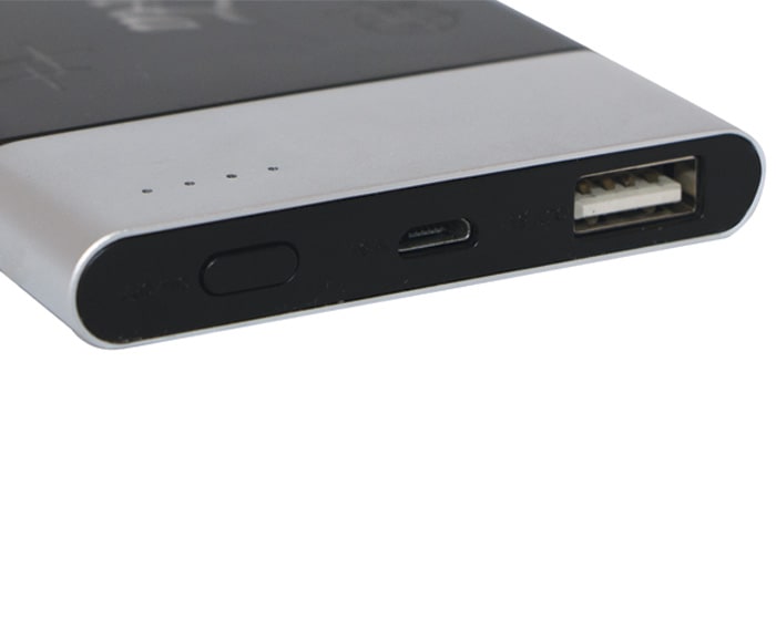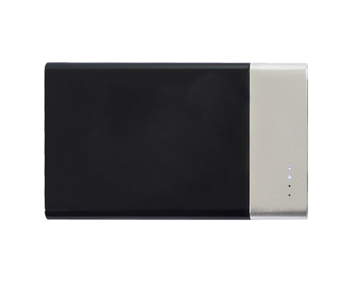 Batería de carga portátil de plástico y aluminio. Capacidad de 4,000 mAh con luz LED e indicador de carga para dispositivos móviles. Incluye cable de conexión para iPhone y Android. Presentación: caja en color blanco.