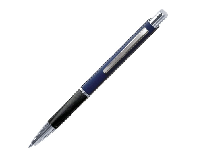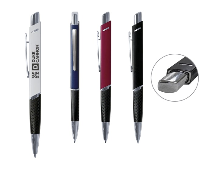 Bolígrafo de aluminio con forma cuadrada, con excelente área para personalizar. Cuenta con punta, clip, aro central y botón en cromo, grip negro con textura. Tinta alemana negra. Mecanismo de click.