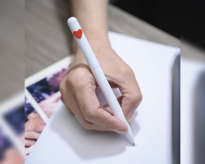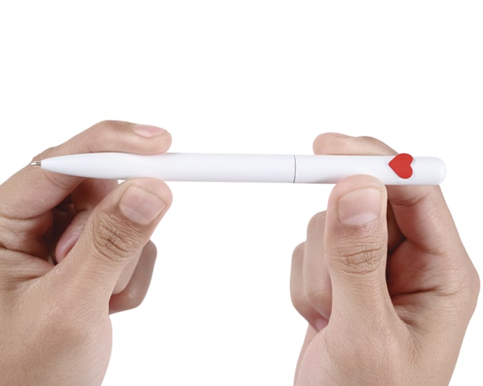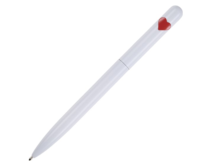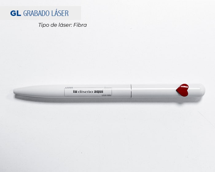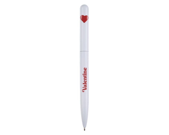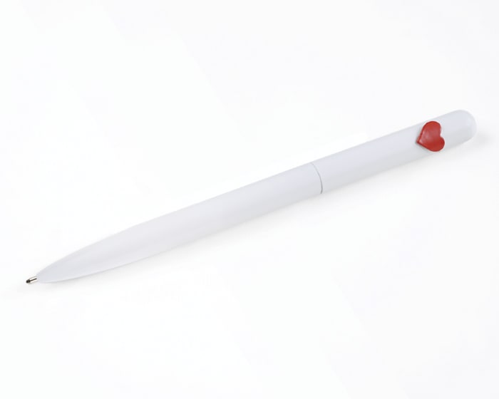 Bolígrafo metálico mate con detalle de corazón, de tinta negra. Al grabar la parte inferior destapa en color plata mate y al grabar la parte superior en CO2, destapa en plata brillante. Mecanismo retráctil.