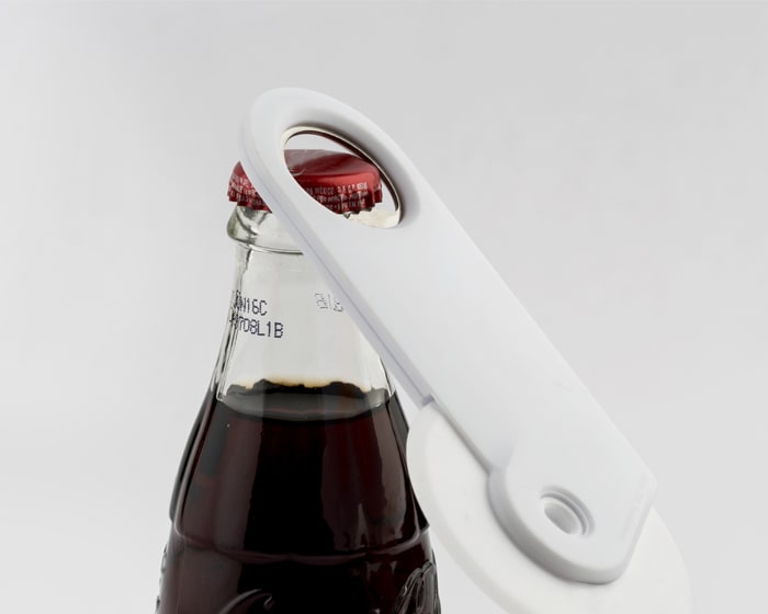 Cortador de plástico para pizza con destapador de metal para botellas.
