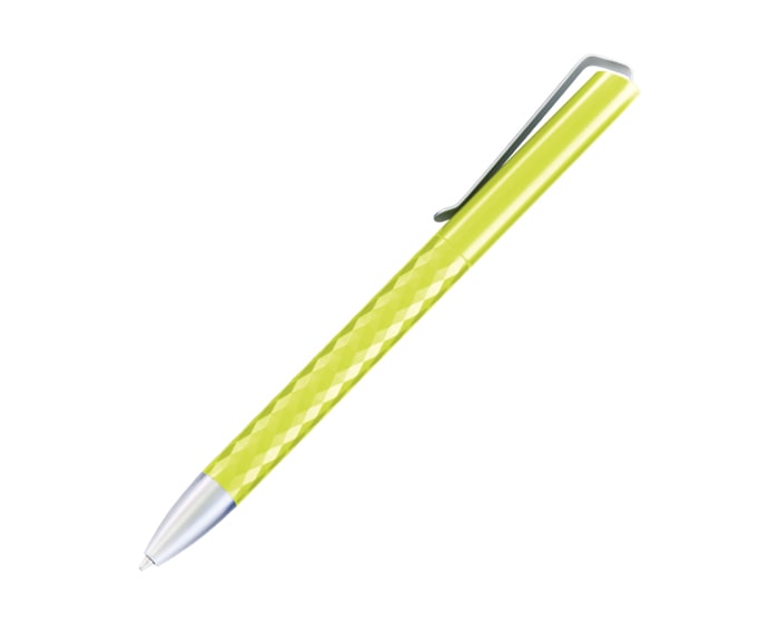 Bolígrafo de plástico con recubrimiento de apariencia metálica. Cuenta con detalles geométricos y clip metálico. Mecanismo retráctil.