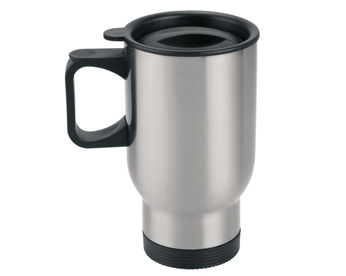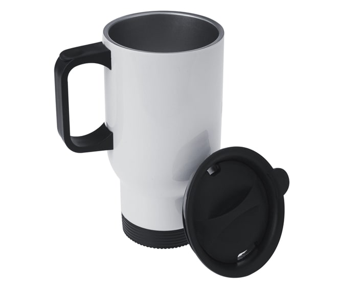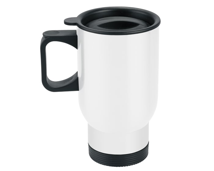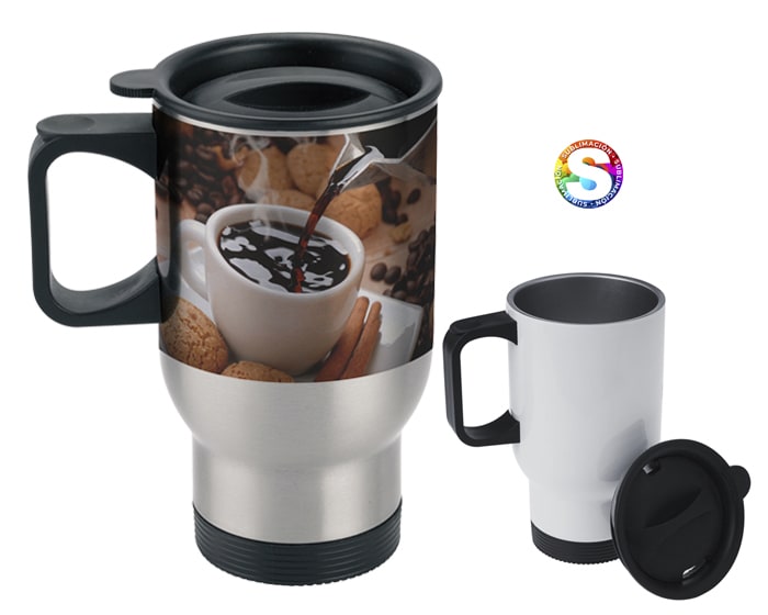 Termo de viaje de acero inoxidable para sublimar, ideal para colorase en el portavaso del auto; cuenta con asa y tapa de plástico con cierre a presión. CAP. 450 ml. (15 OZ). Presentación: caja individual.