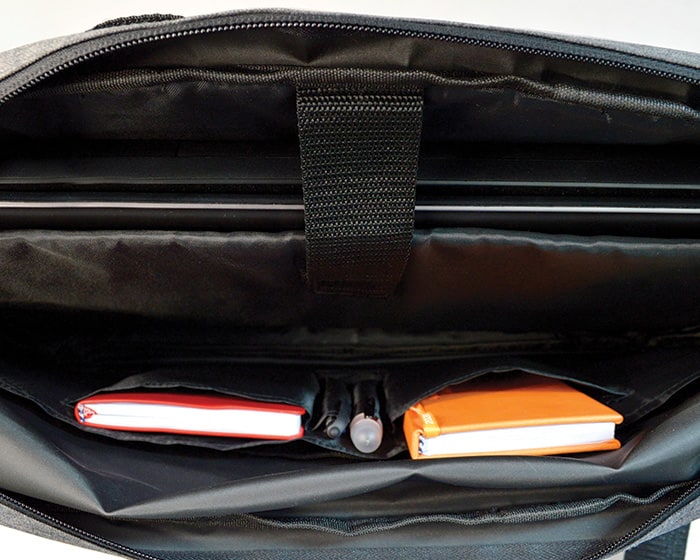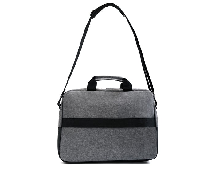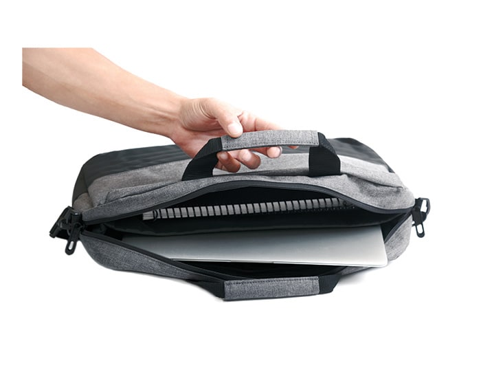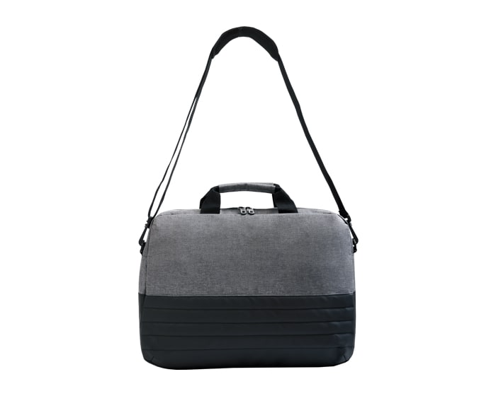 Maletín porta laptop de 15.6 pulgadas con diseño tipo curpiel con interior acolchado y compartimentos para accesorios. Correa larga ajustable y asas. Banda para sujetarse sobre maleta de viaje.