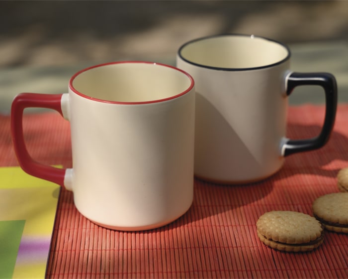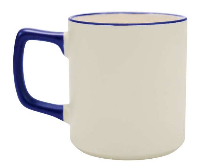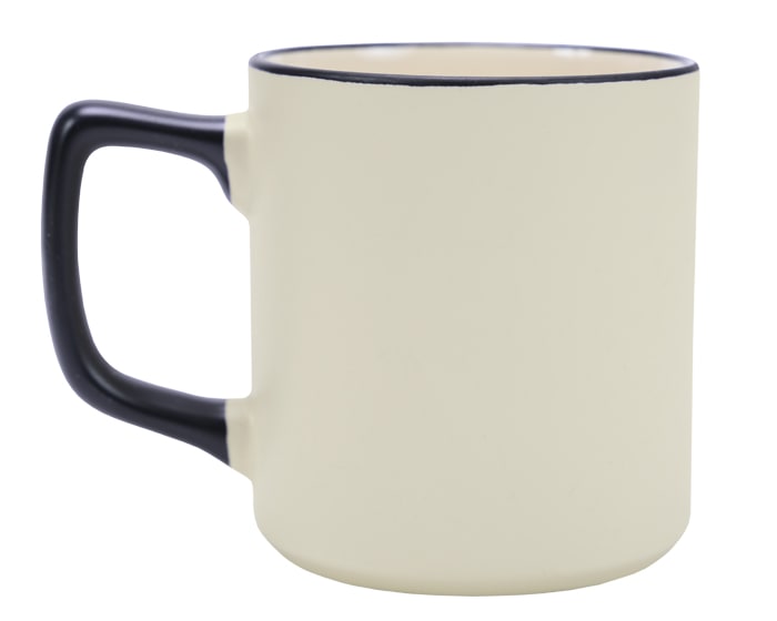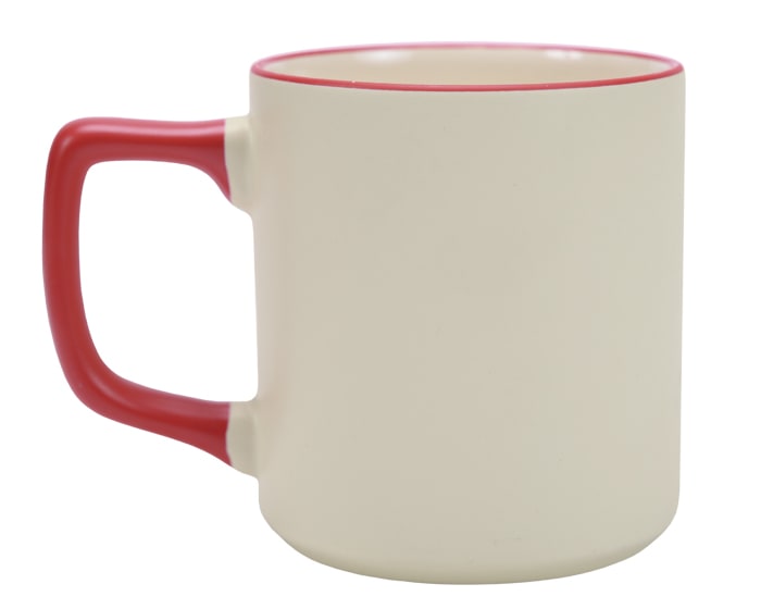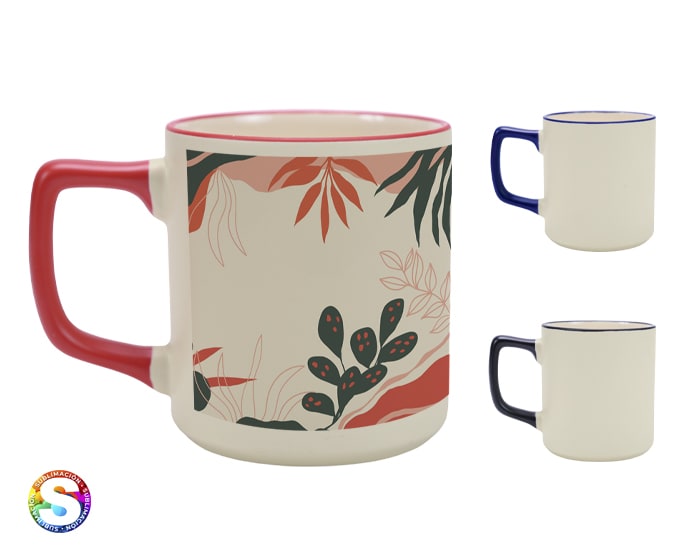 Tarro de cerámica de sublimación con asa y filo de color. CAP. 400 ml. (13.5 OZ). Venta en múltiplos de 12. Artículo Promocional