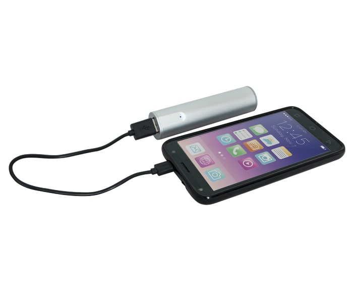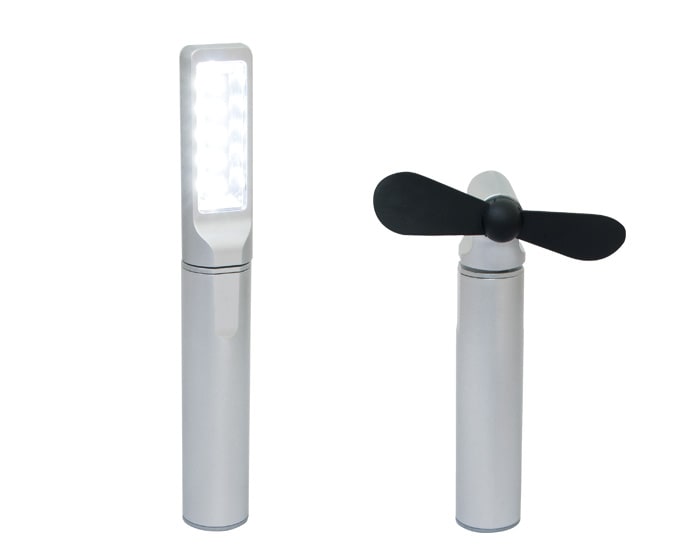 Kit de accesorios con batería de carga portátil 2200 mAh, lámpara LED y mini ventilador. Incluye estuche y cable de carga. Artículo Promocional