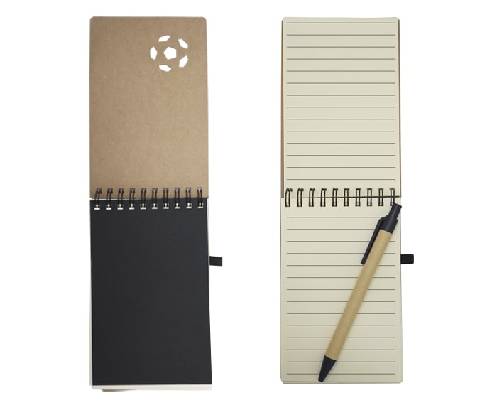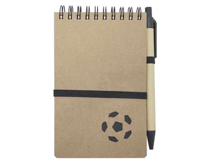 Libreta ecológica de cartón con diseño de balón de fútbol, 70 hojas rayadas (140 páginas), espiral metálico color negro y cinta elástica. Incluye bolígrafo de papel con clip de plástico.