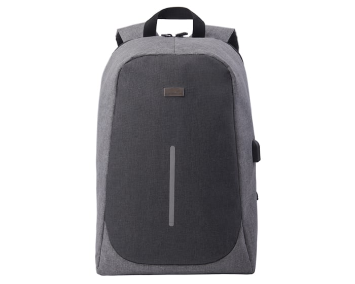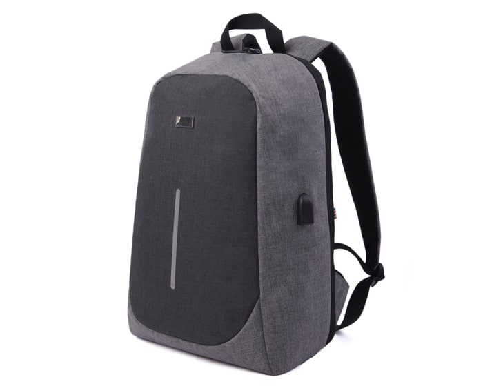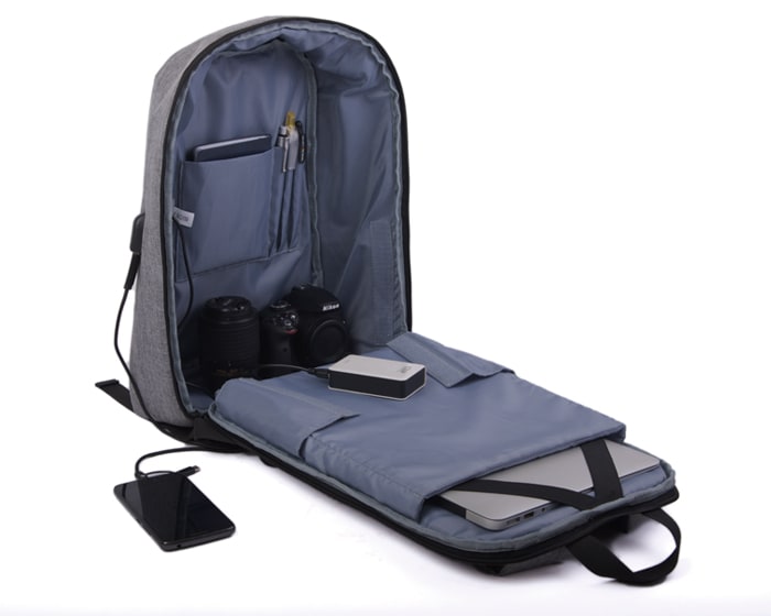 Mochila tipo backpack antirrobo para laptop con 2 compartimentos, cierre exterior disimulado, correas acolchadas ajustables, cinta reflejante, banda para sujetarse sobre maleta de viaje y asa superior. Abre totalmente a 180 grados. Para laptop de hasta 16 pulgadas. Interior acolchado con compartimentos para accesorios. Contiene un puerto de USB en el lado derecho de la bolsa para que conectes tu celular.