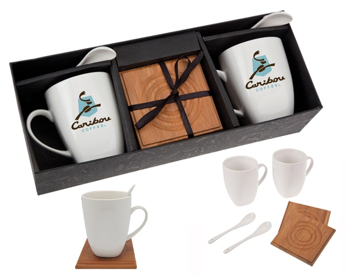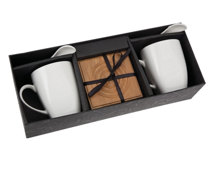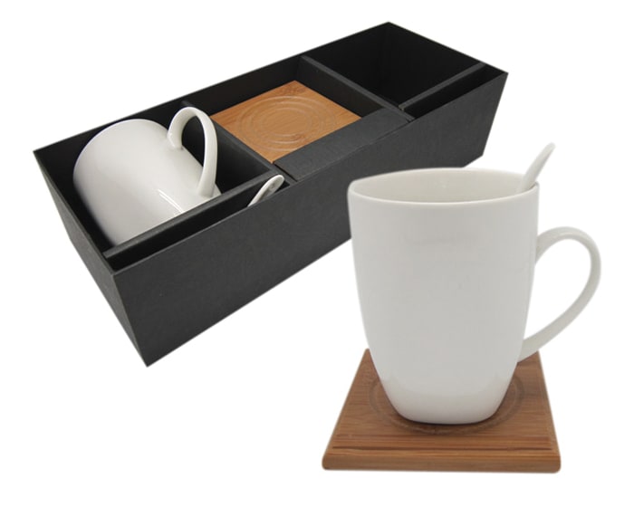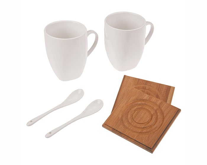 Set para café o té con cucharas y porta tazas de bambú, para 2 personas. CAP. por taza: 10 OZ. Presentación: caja de regalo en color negro. Contenido: 6 Pzas.