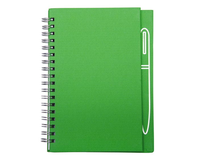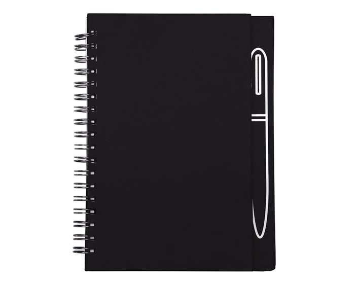 Libreta de espiral con 70 hojas rayadas (140 páginas). Cuenta con imán en la parte trasera para sostener un bolígrafo metálico y separador de listón. (No Incluye bolígrafo).