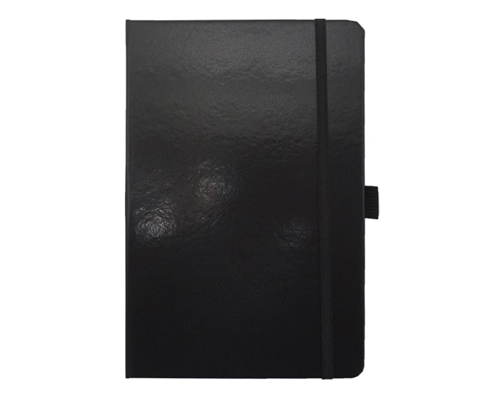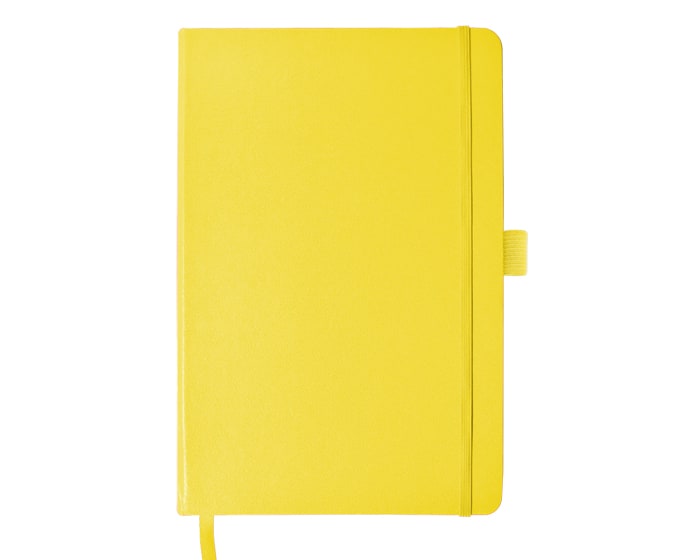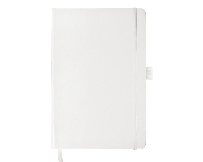 Libreta de pasta dura tamaño A5, con forro plástico, 80 hojas rayadas (160 páginas). Incluye separador de listón y banda elástica para sujetar la cubierta y bolígrafo (no incluido).