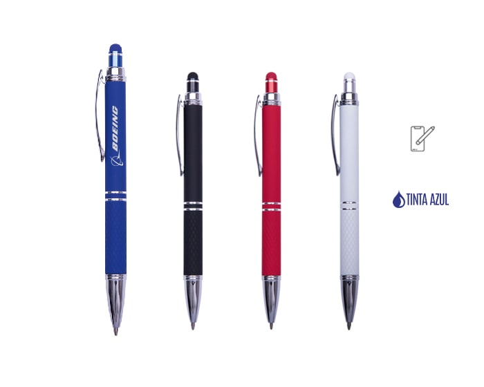 Bolígrafo de aluminio de tinta azul, con recubrimiento de goma, parte inferior con textura. Detalles y clip metálico. Punta touch y mecanismo de click.