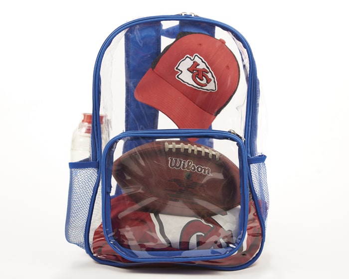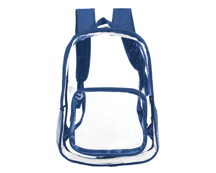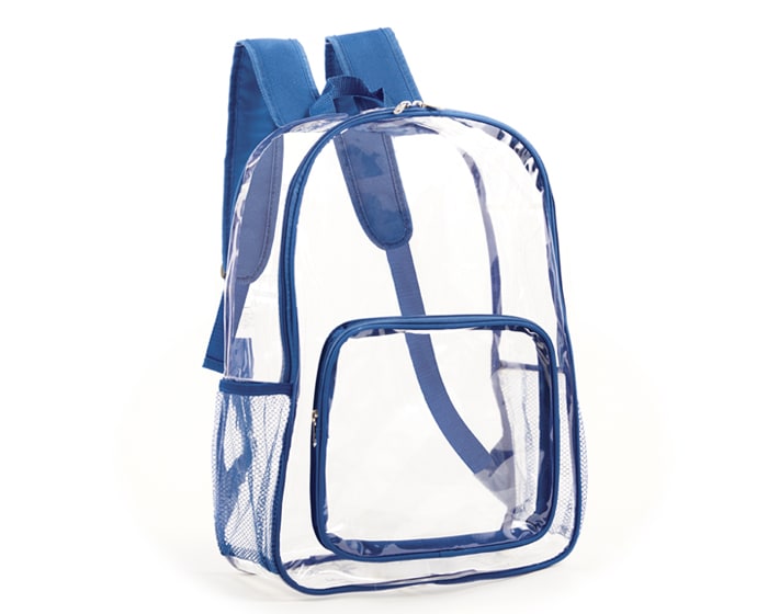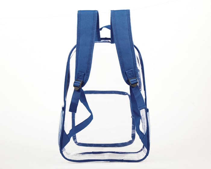 Mochila escolar de PVC transparente, con un compartimento frontal, bolsillos de malla laterales, asa superior y tirantes con correas ajustables. Artículo Promocional