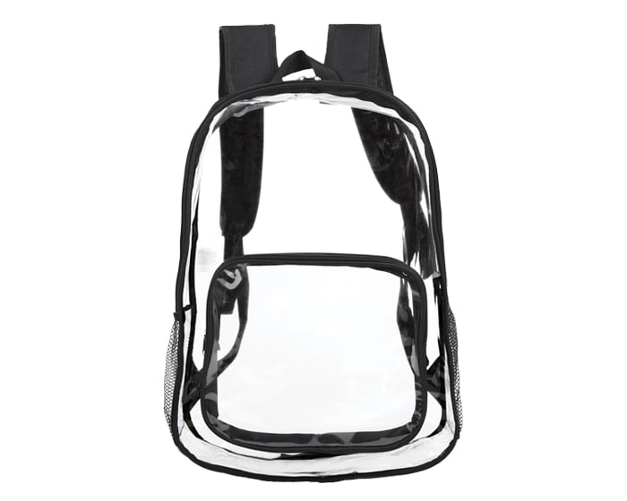 Mochila escolar de PVC transparente, con un compartimento frontal, bolsillos de malla laterales, asa superior y tirantes con correas ajustables.