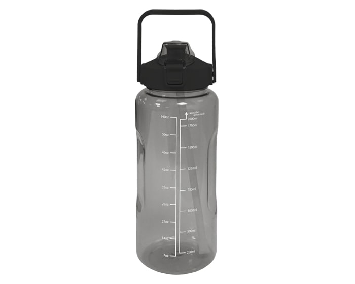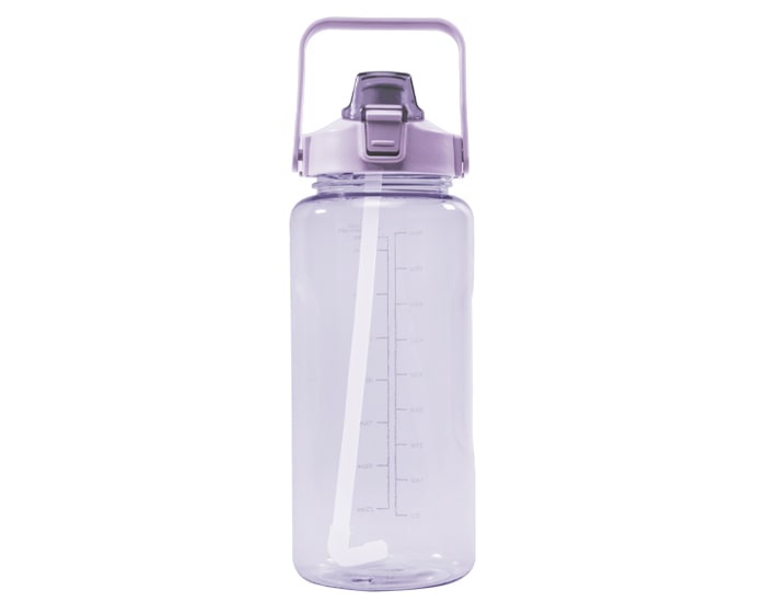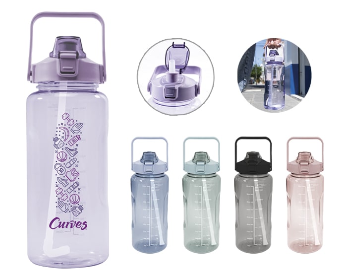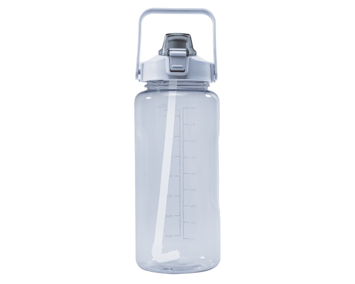Cilindro de plástico en colores traslúcidos, con escala impresa en el cuerpo de la botella y resaques laterales para facilitar el agarre. Cuenta con tapa de rosca con asa, en color sólido y popote transparente, boquilla con sobre tapa con seguro en color traslúcido. CAP. 2 Lts.