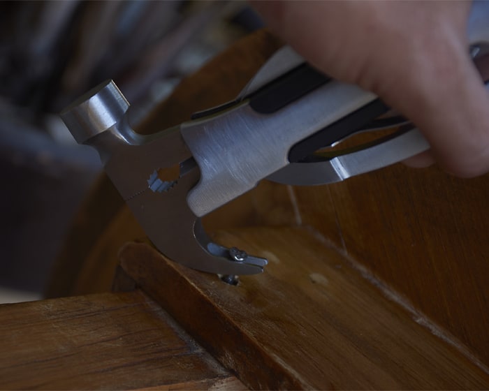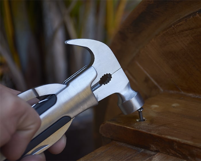 Herramienta plegable tipo martillo con 11 funciones. Incluye: martillo, pinzas, cortador de alambre, sacaclavos, 2 desarmadores planos, desarmador de cruz, destapador, lima, cuchillo y sierra. Cuenta con seguro de bloqueo para fijar las herramientas. Incluye estuche. Presentación: caja en color blanco.
